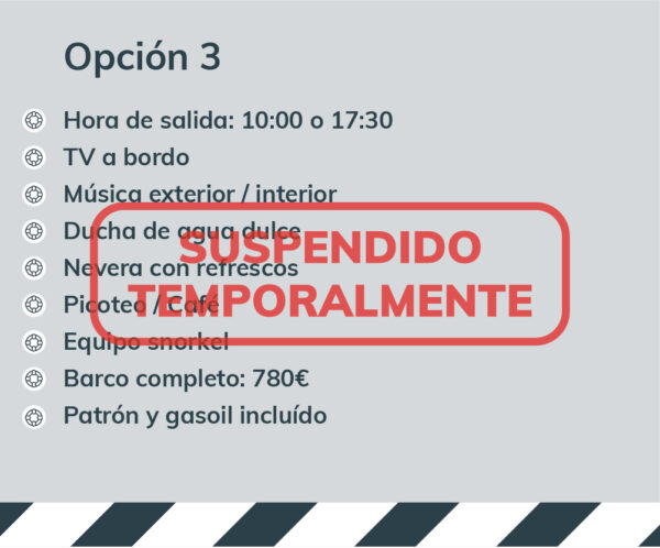 Máximo 12 personas. El barco no se compartirá con personas ajenas al grupo, por tanto se reservará el barco completo en cualquiera de las opciones.