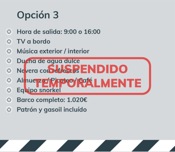 Máximo 12 personas. El barco no se compartirá con personas ajenas al grupo, por tanto se reservará el barco completo en cualquiera de las opciones.
